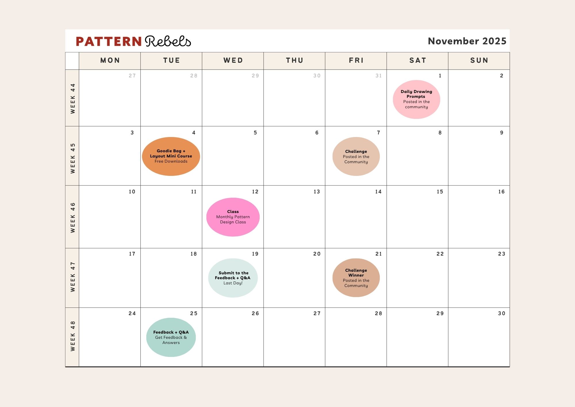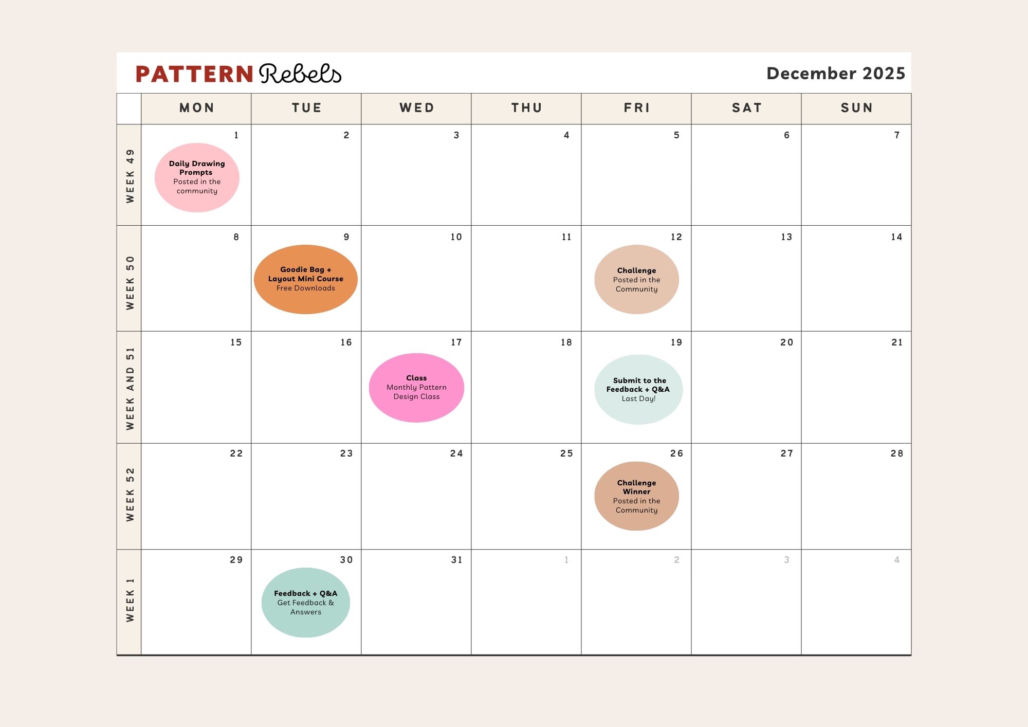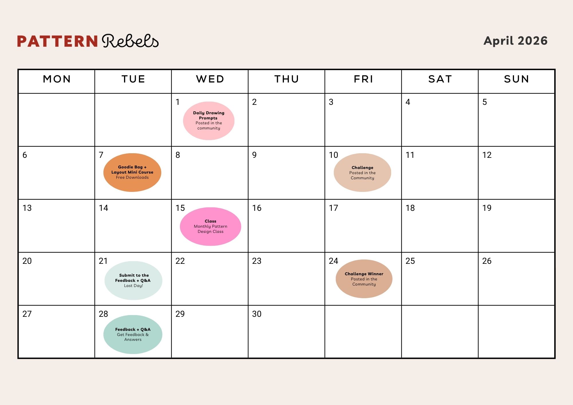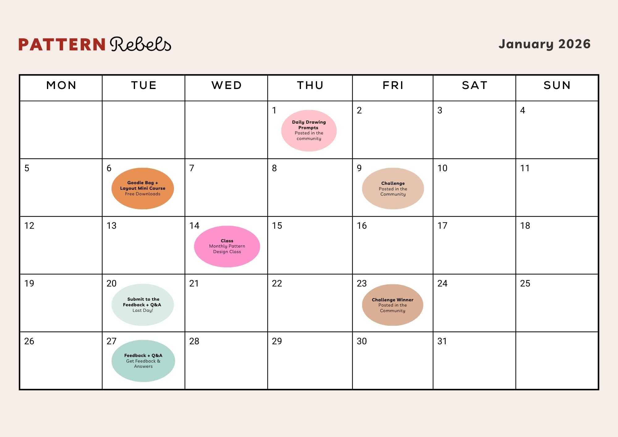 In this calendar you can see what's happening in the Pattern Rebels membership this month. You can save this image to your iPad by tap and hold the image and choose "save image".