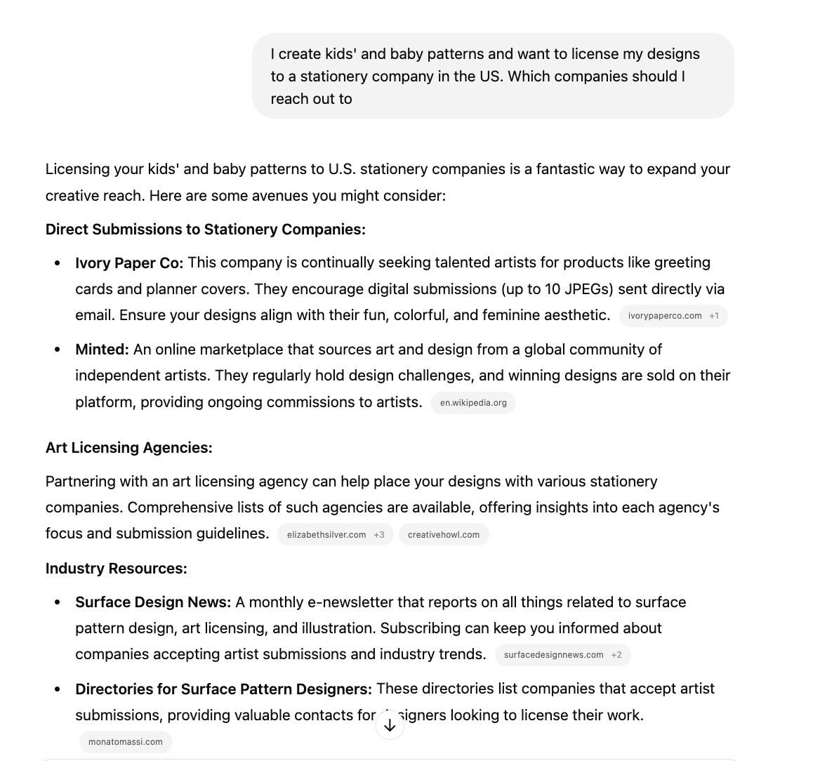 Most AI tools give broad, generic answers that aren’t tailored to licensing and client outreach. Client Finder GPT is designed specifically for surface designers and illustrators, so you’ll get: