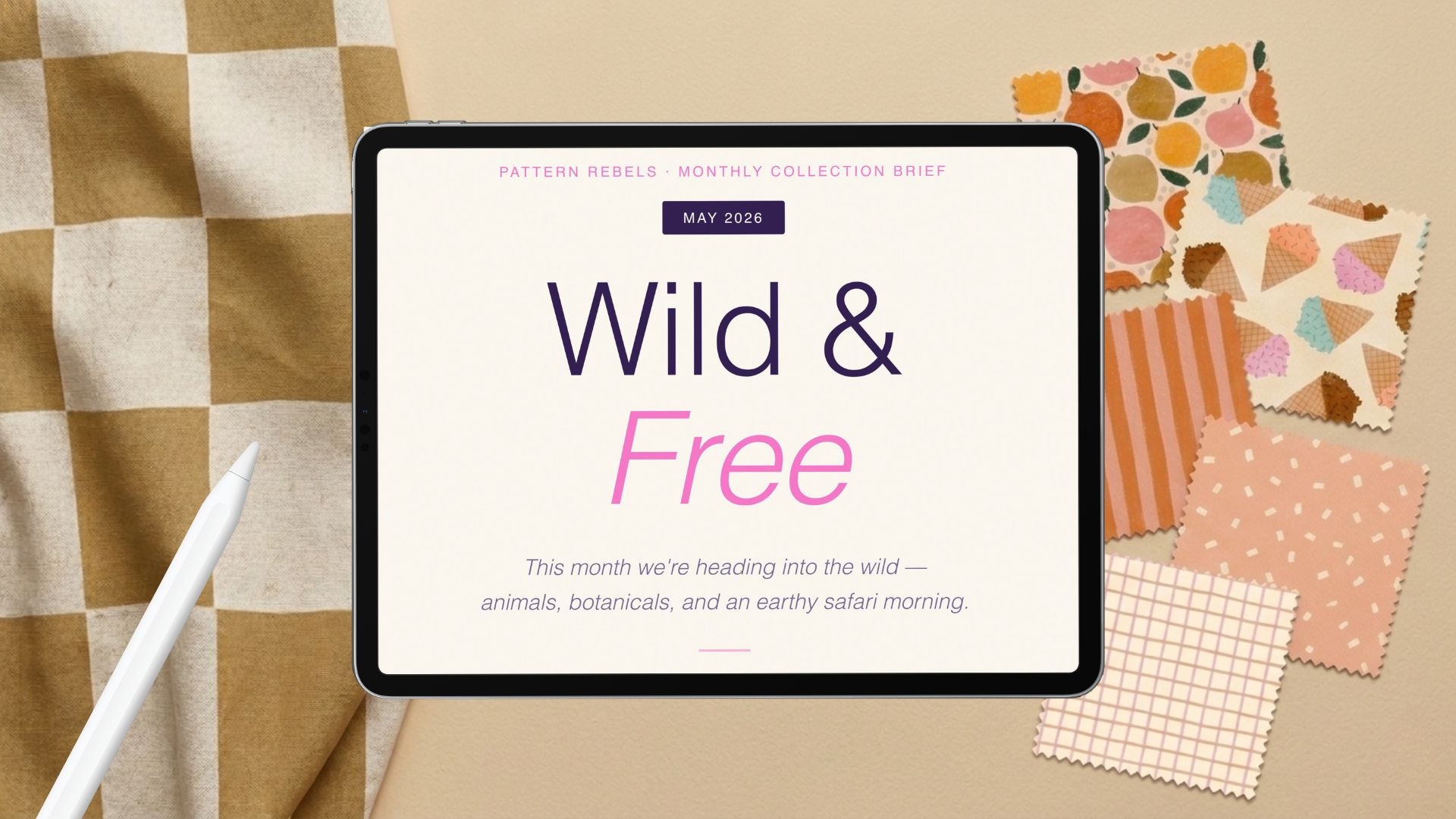 Your May Collection Brief is here. This month's theme is Wild & Free — animals, botanicals, and an earthy safari morning feeling. Inside you'll find your collection palette, motif inspiration, a four-week creative schedule, and everything you need to build a beautiful three-piece collection this month — from your first sketch to your finished patterns.
