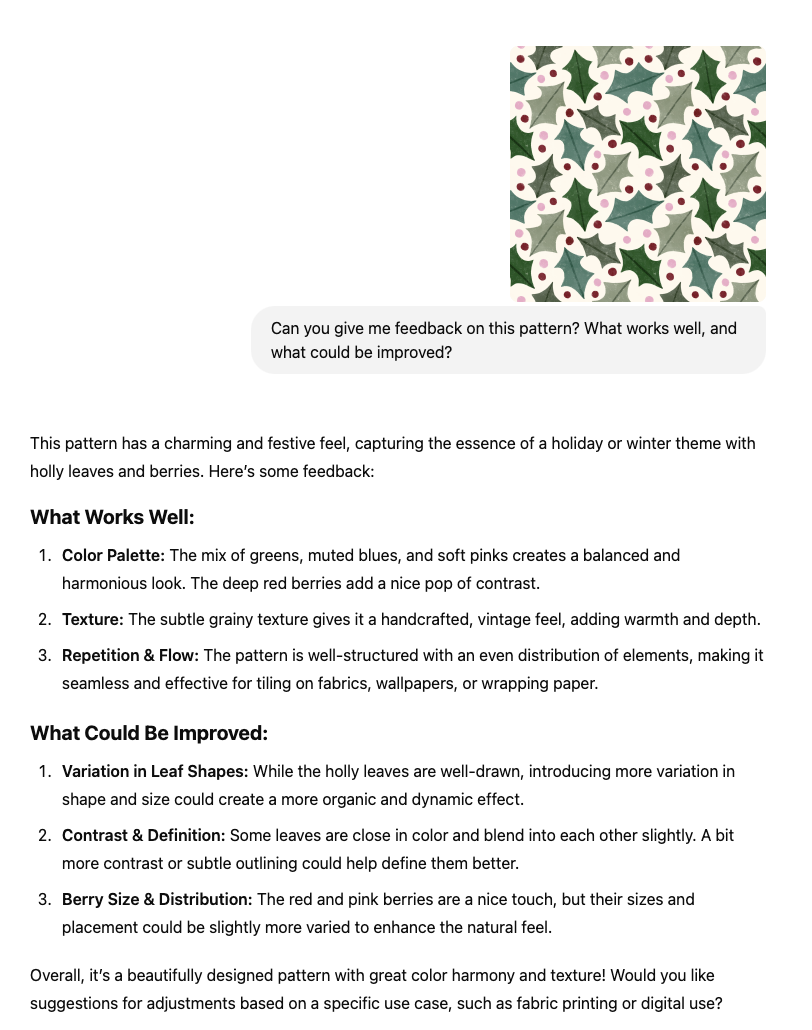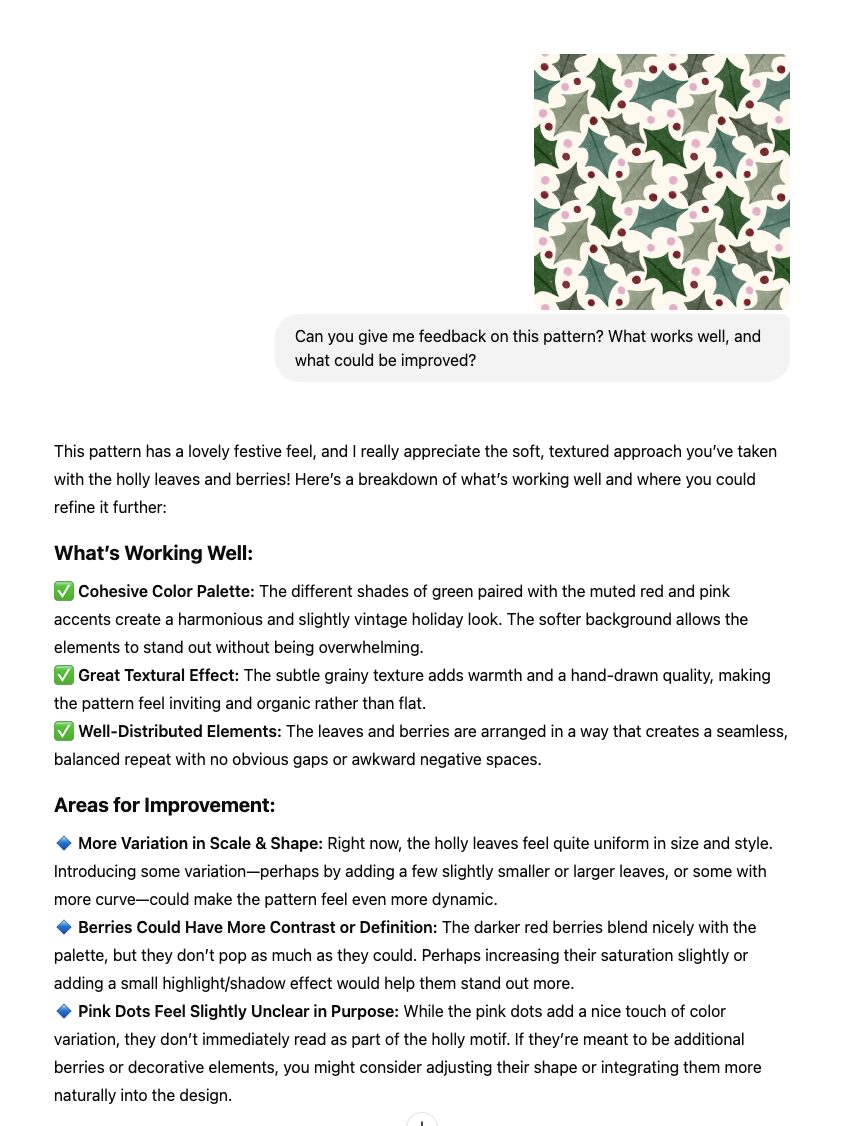 Upload your pattern or illustration—ask for feedback on color, composition, balance, or any specific area.