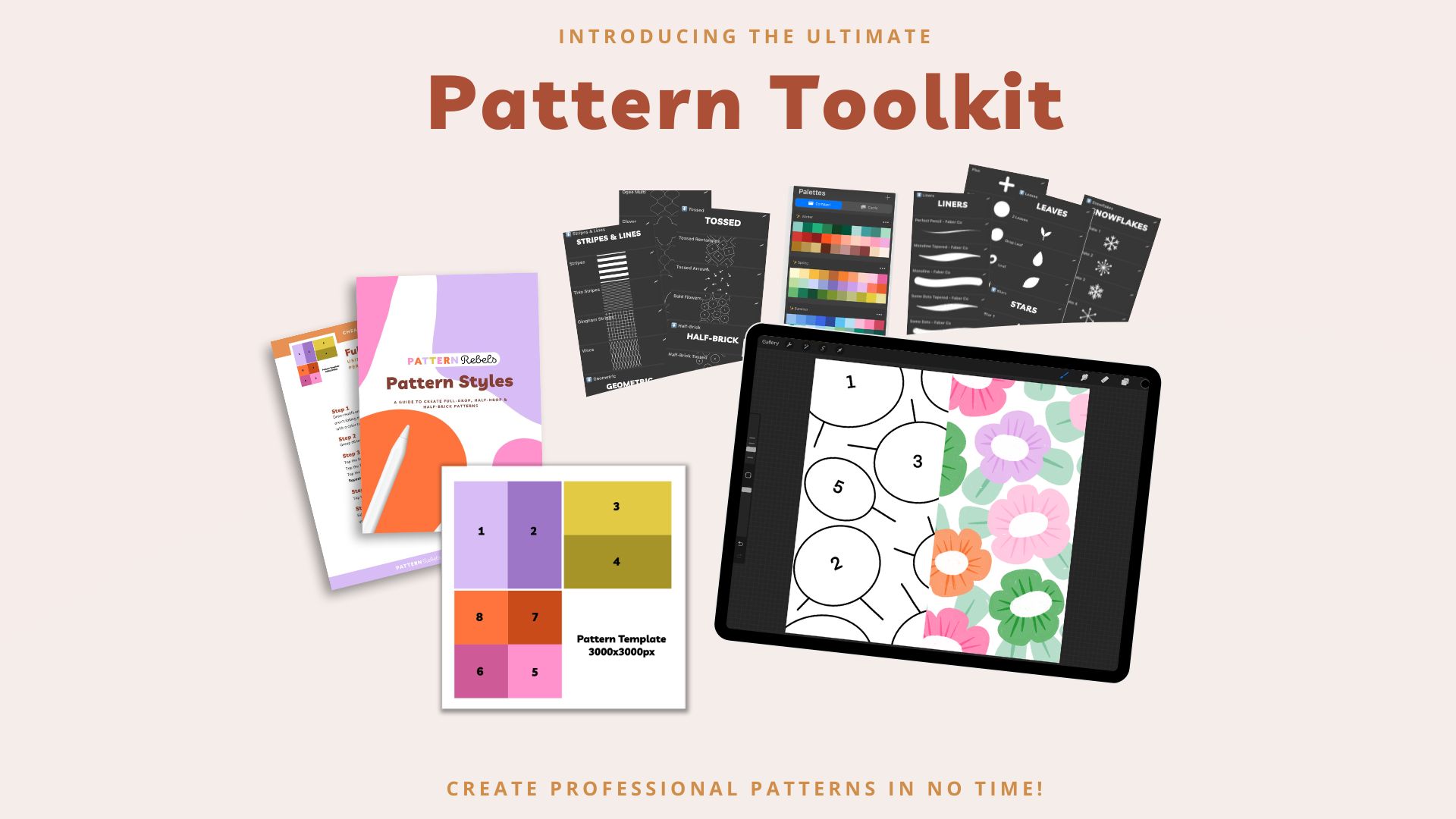 Pattern Toolkit (Includes: 25 pattern layouts + mini-courses, 30 pattern elements brushes, 4 seasonal color palettes & 1 pattern perfect template)